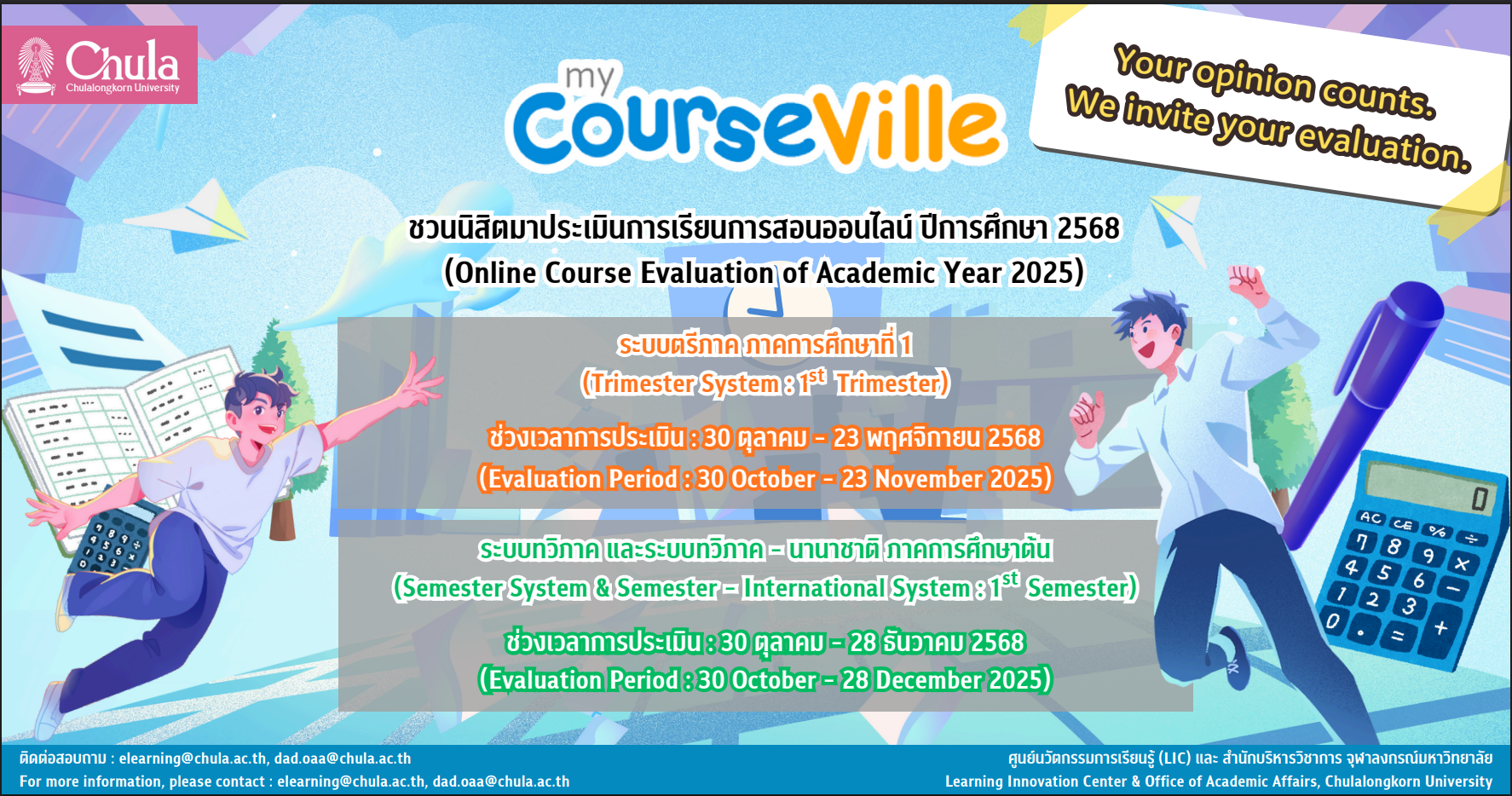 ระบบตรีภาค ภาคการศึกษาที่ 1 ปีการศึกษา 2568ช่วงเวลาการประเมิน: 30 ตุลาคม – 23 พฤศจิกายน 2568ระบบทวิภาค และระบบทวิภาค – นานาชาติ ภาคการศึกษาต้น ปีการศึกษา 2568ช่วงเวลาการประเมิน: 30 ตุลาคม – 28 ธันวาคม 2568ผ่านระบบ myCourseVille: https://www.mycourseville.com/